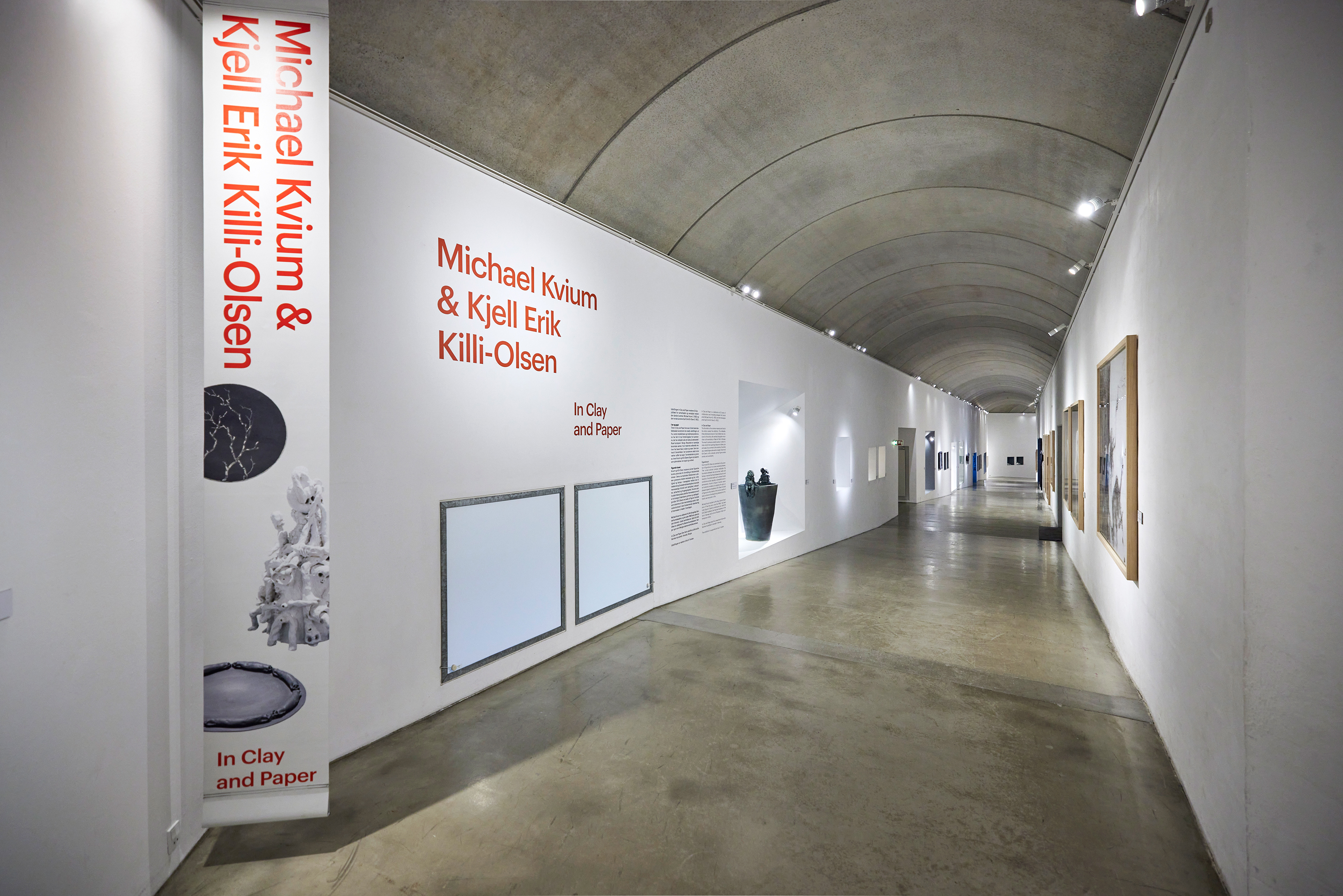 Exhibition Design for In Clay an paper. The exhibition included works on paper and expressive ceramic sculptures by two artists: Danish Michael Kvium and Norwegian Kjell Erik Killi-Olsen. The exhibition were held at Trapholt Museum in Kolding.